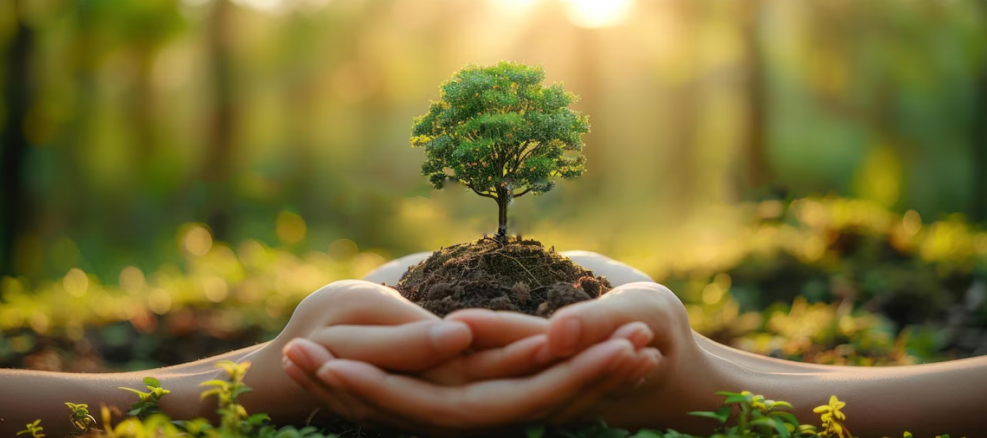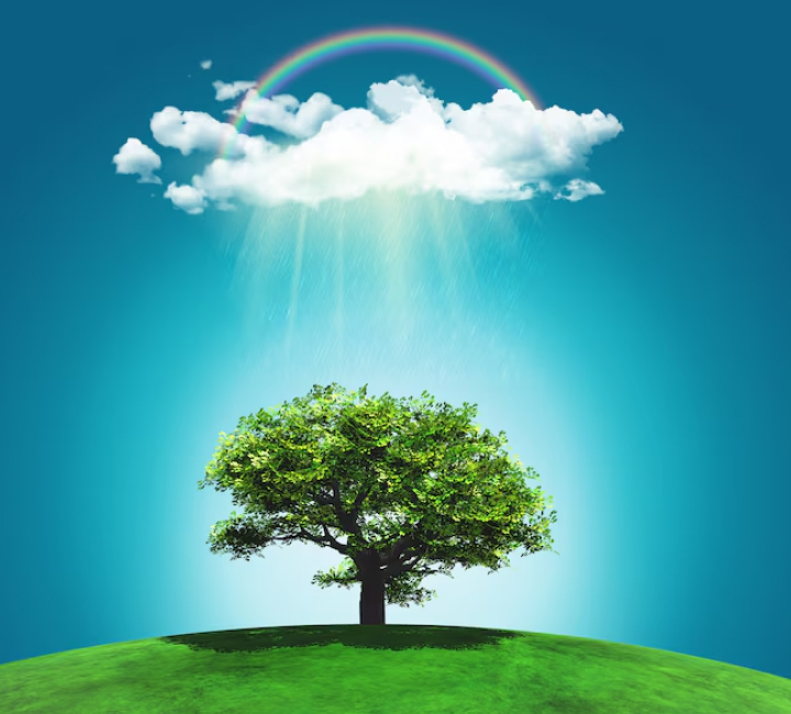 Green trees symbolize renewal, contrasting starkly with the desert.